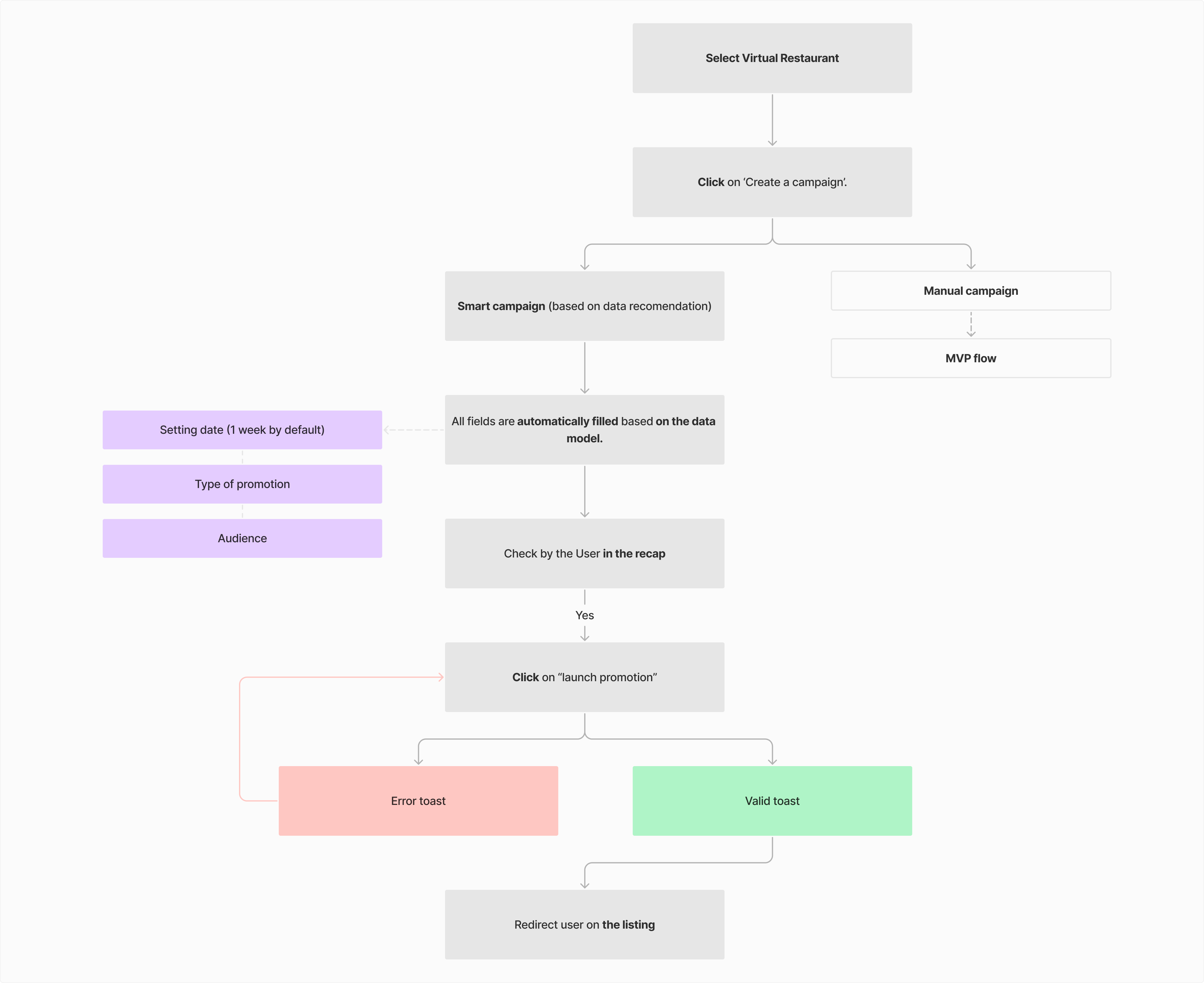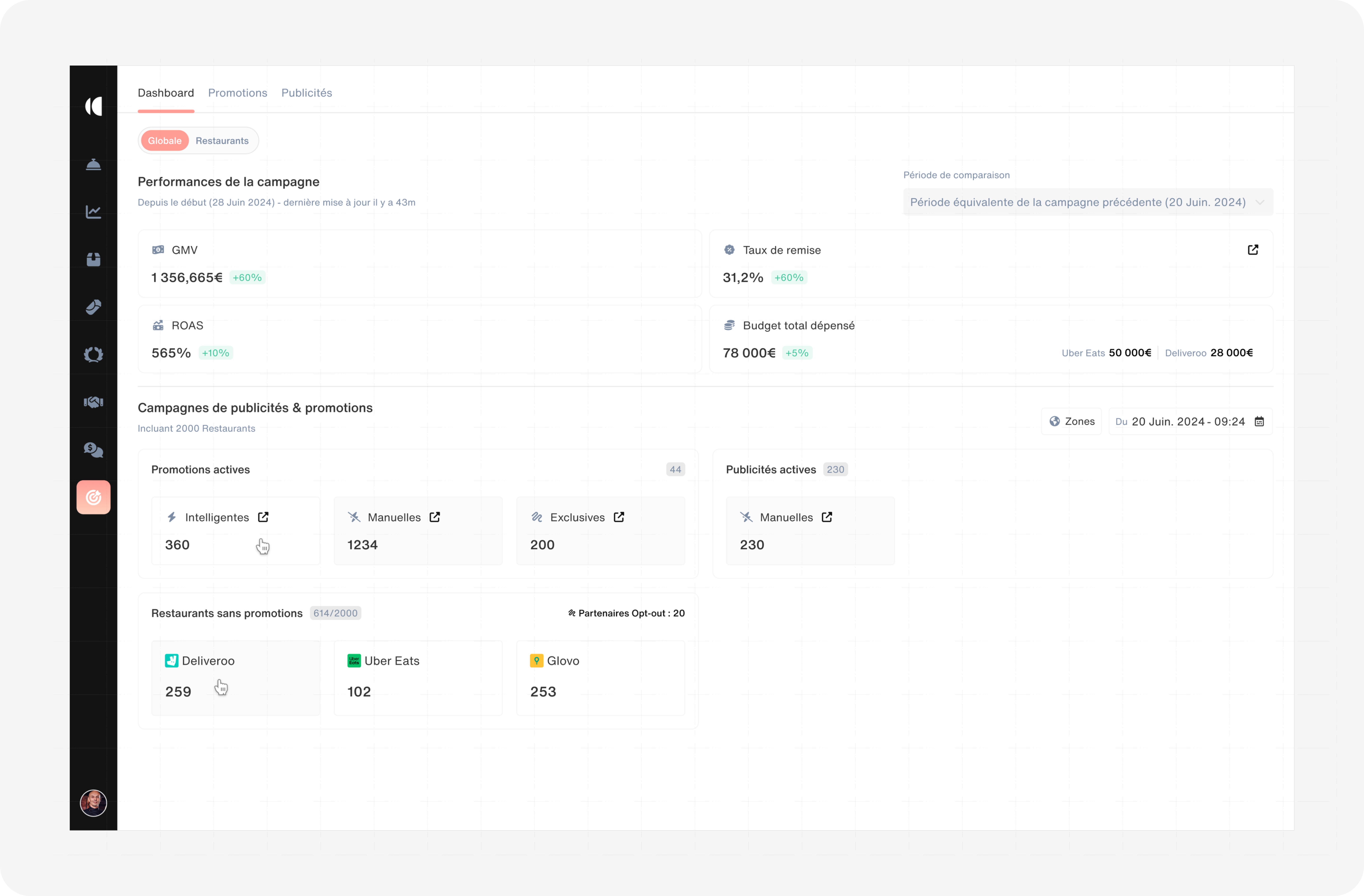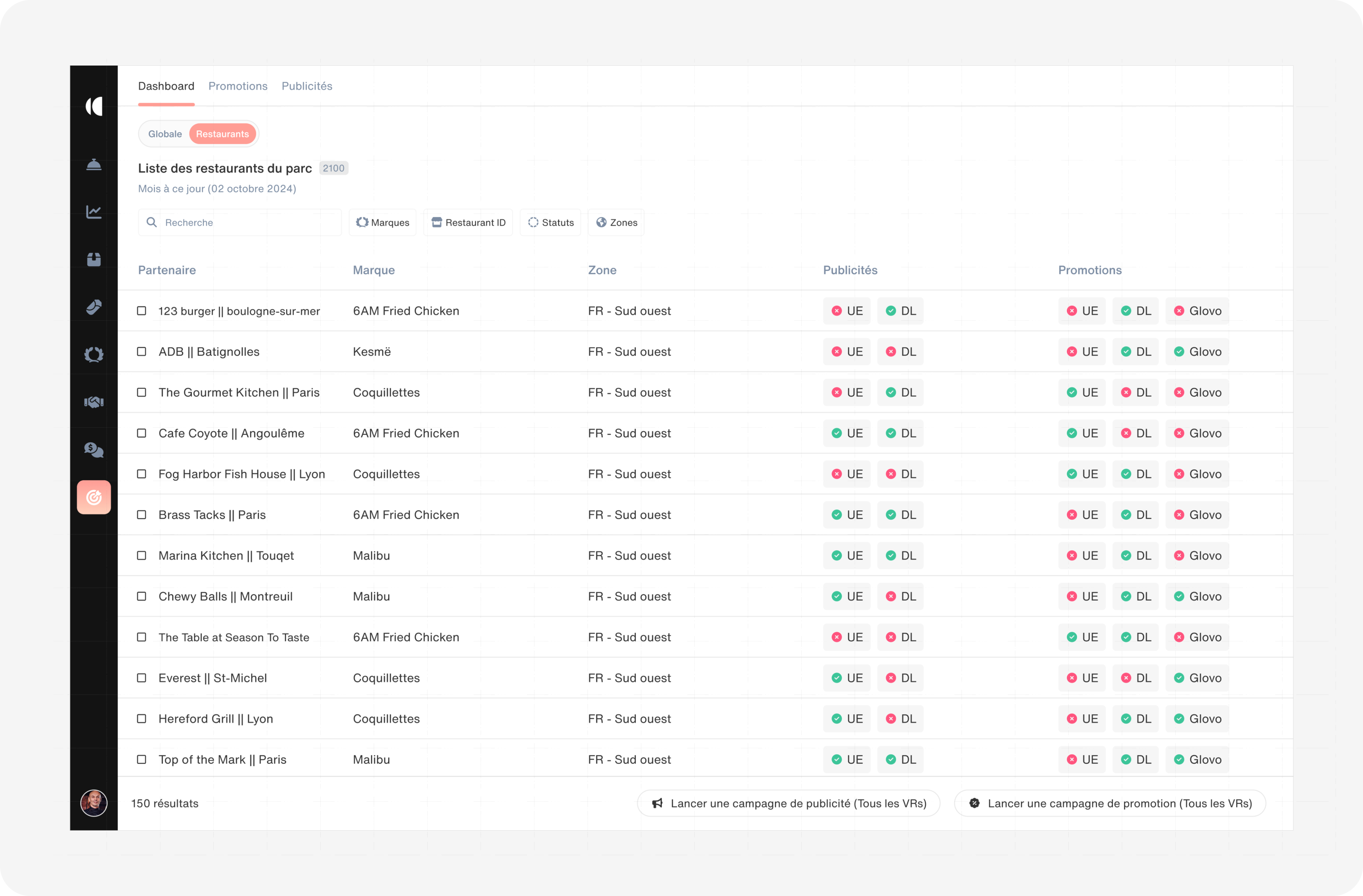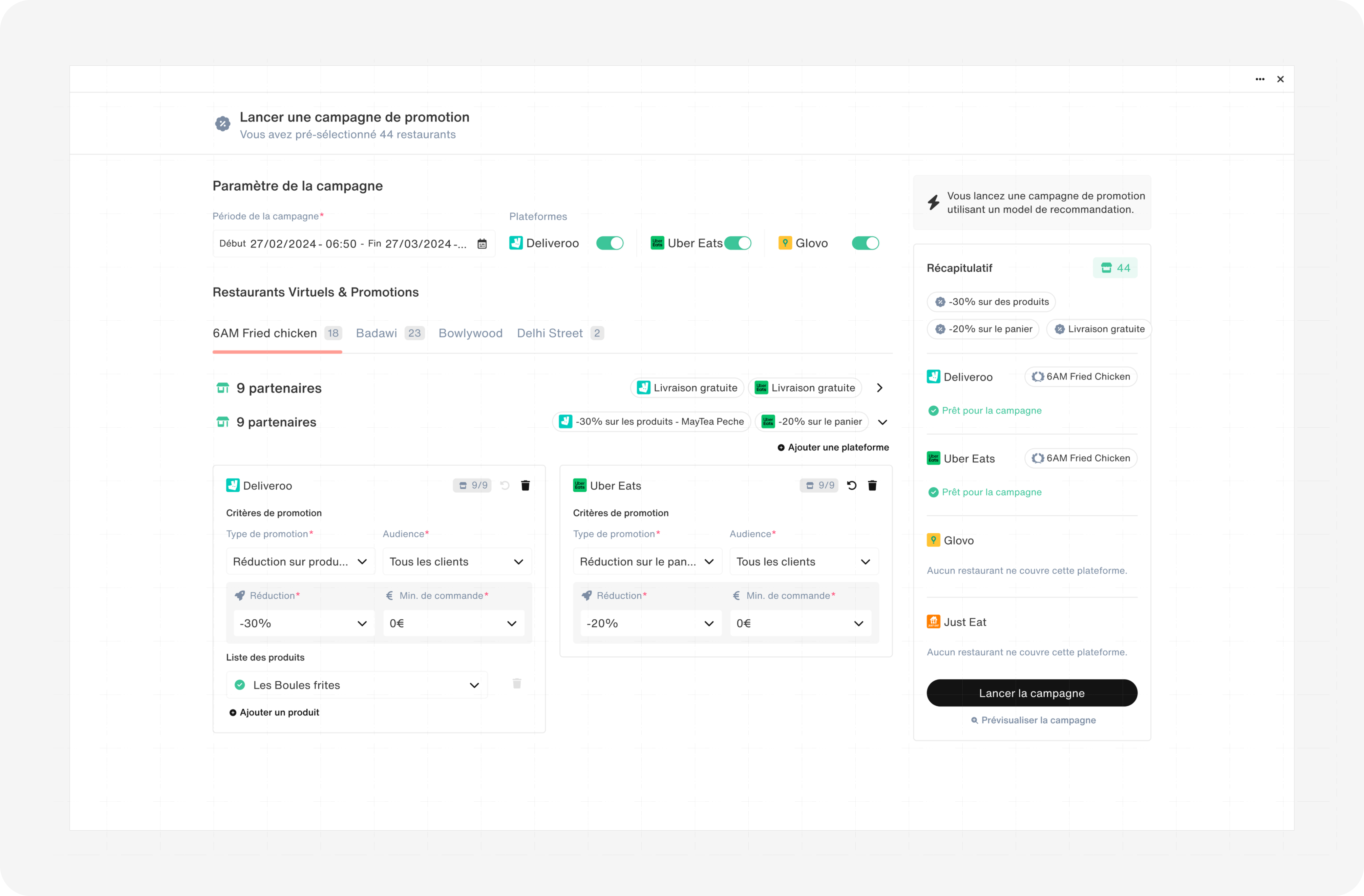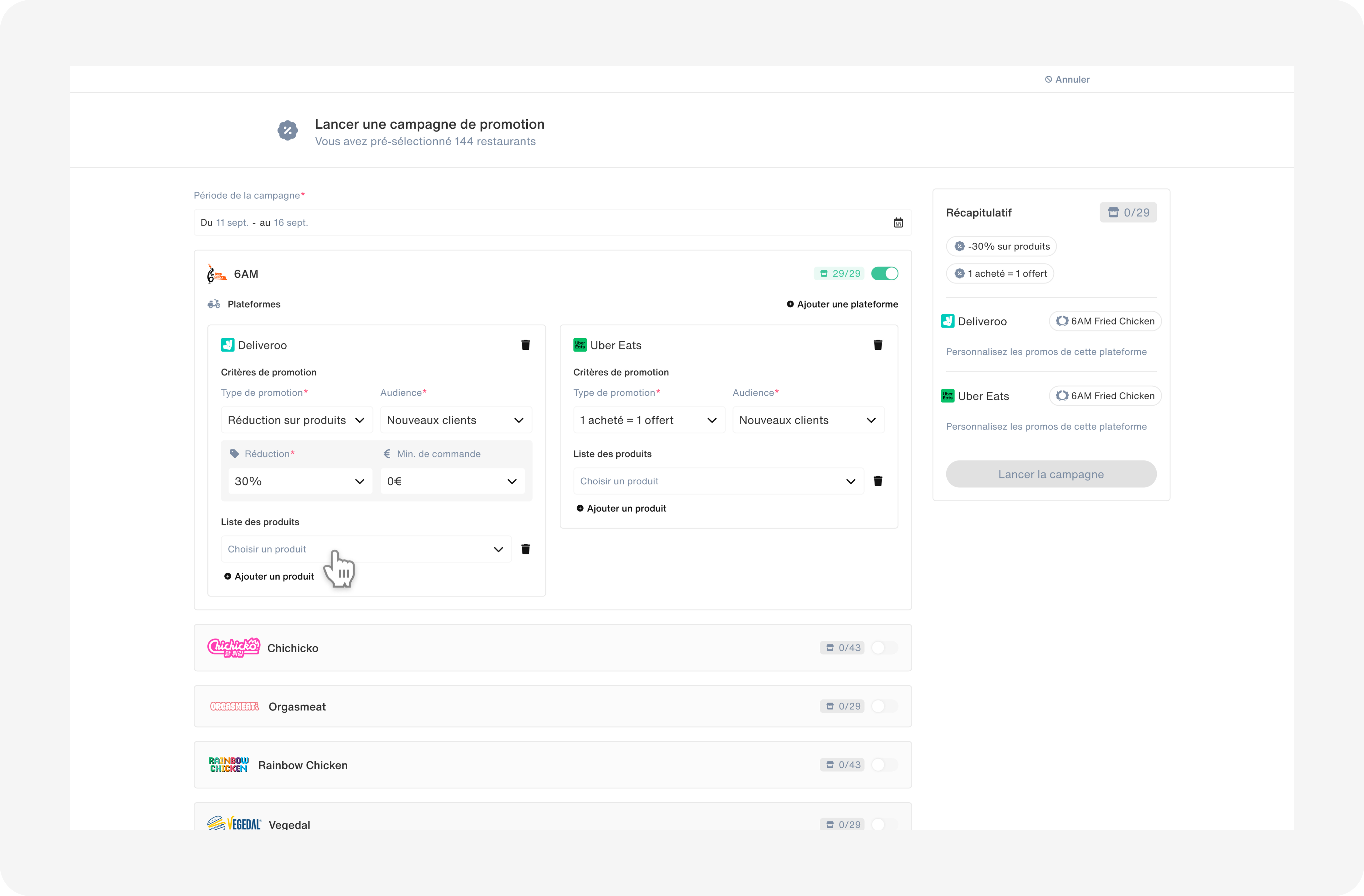 At Clone, as a Product Designer, I worked on a project to completely rethink the management of marketing campaigns for our virtual restaurants on Uber Eats and Deliveroo. Until now, these campaigns—whether promotions or advertisements—were managed through external tools like Flynt and Google Sheets.