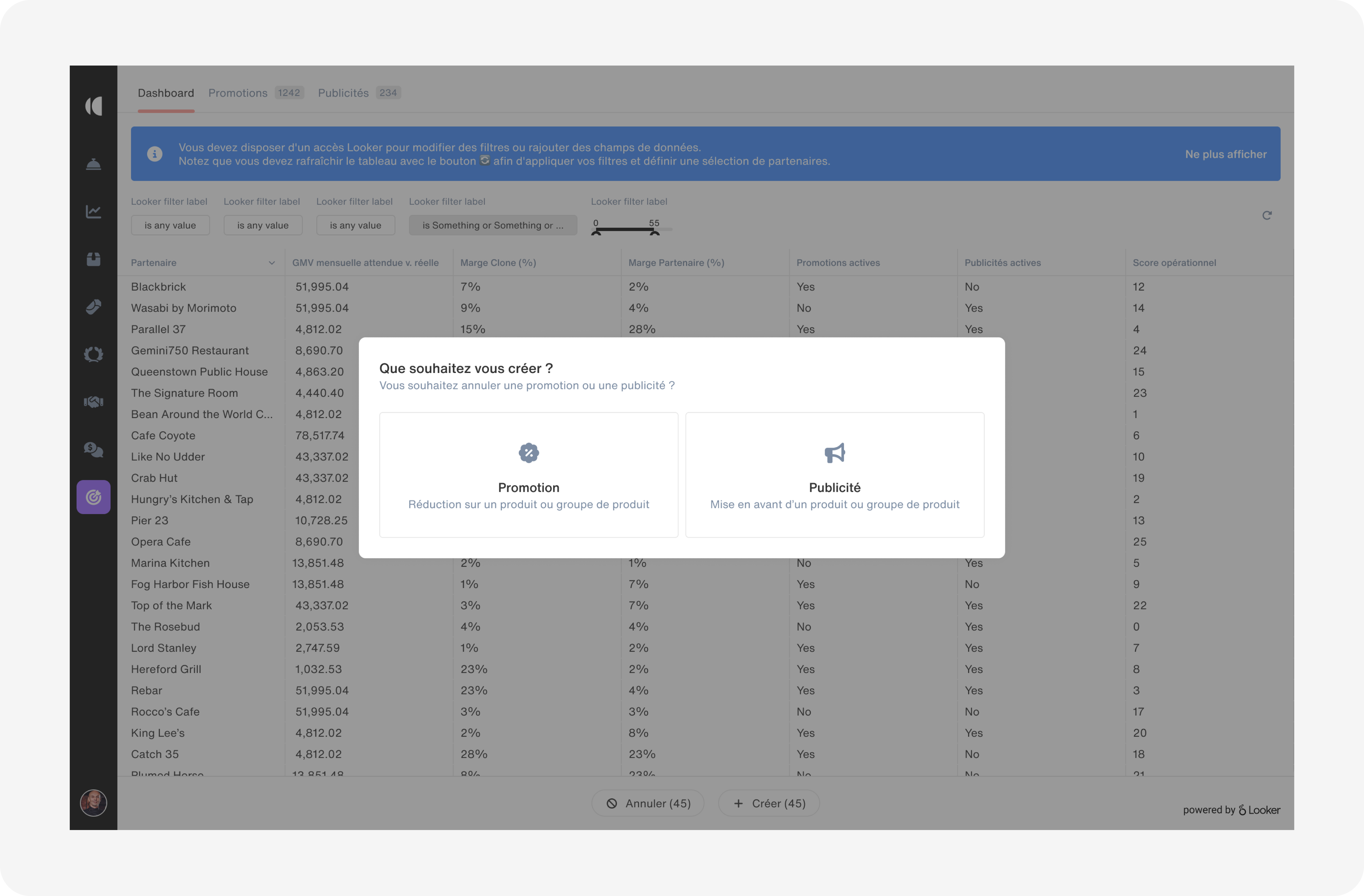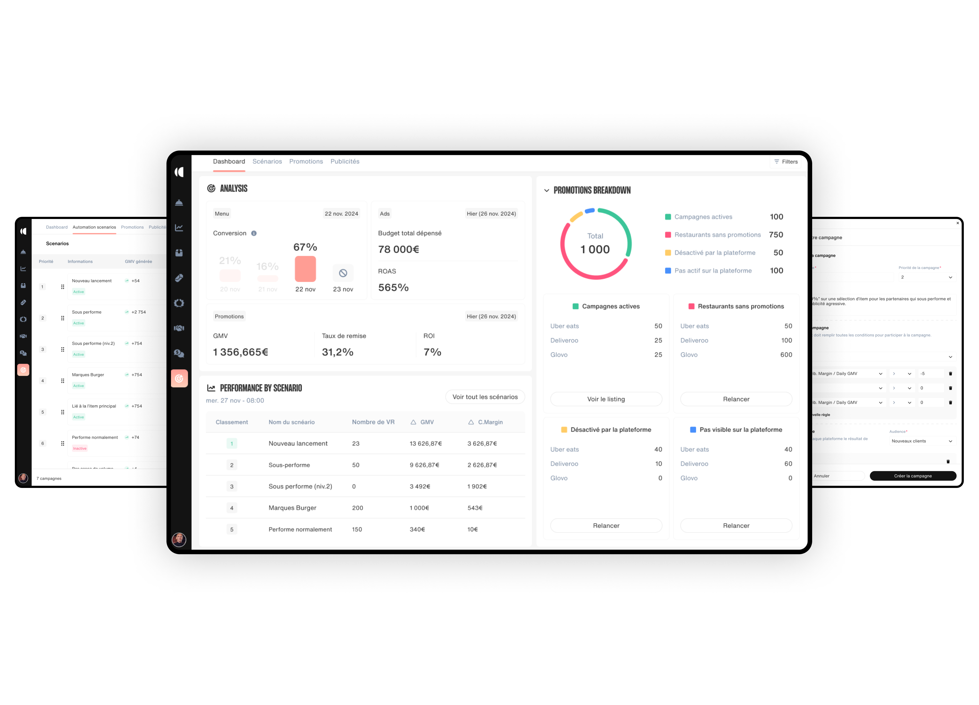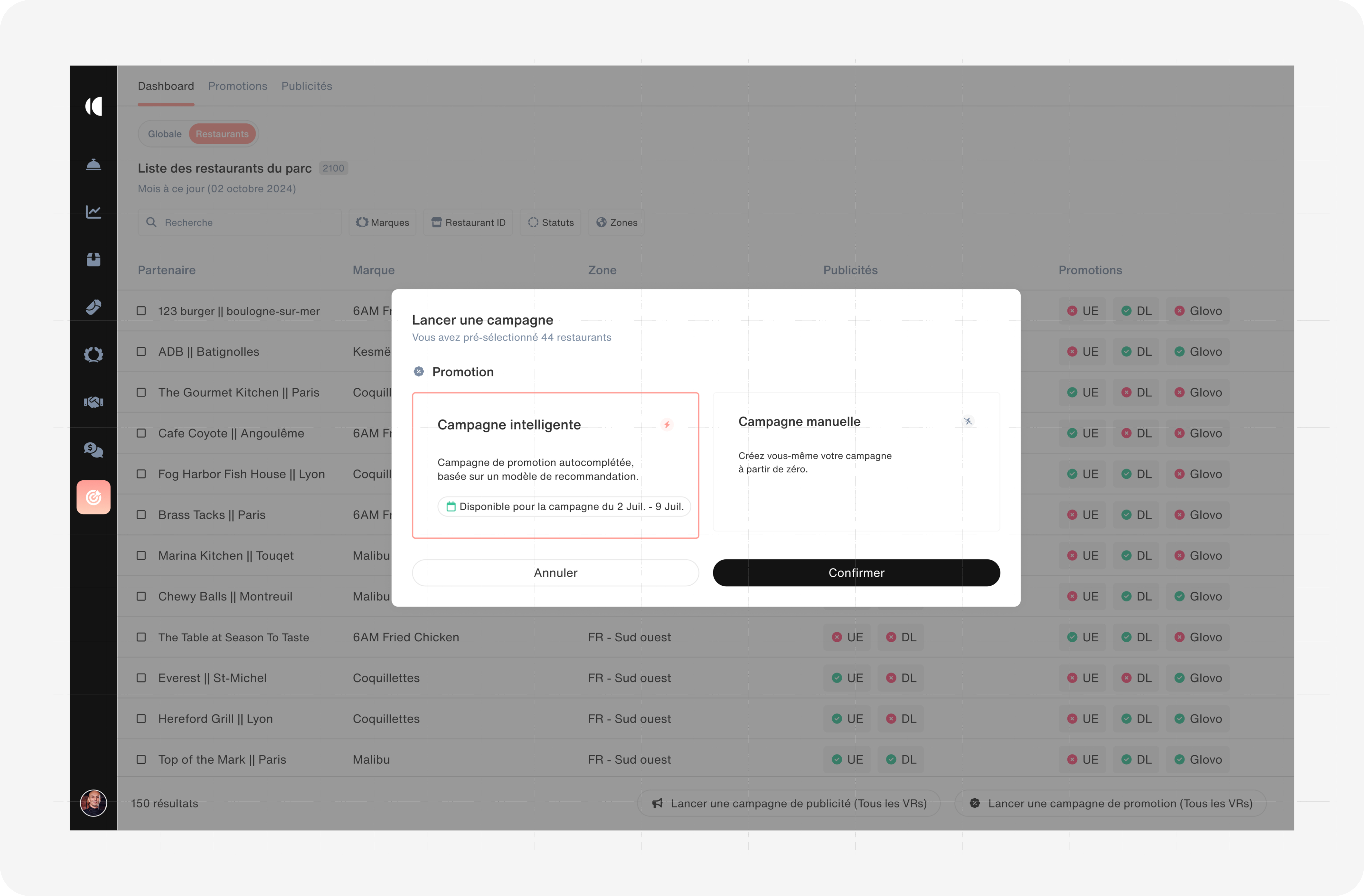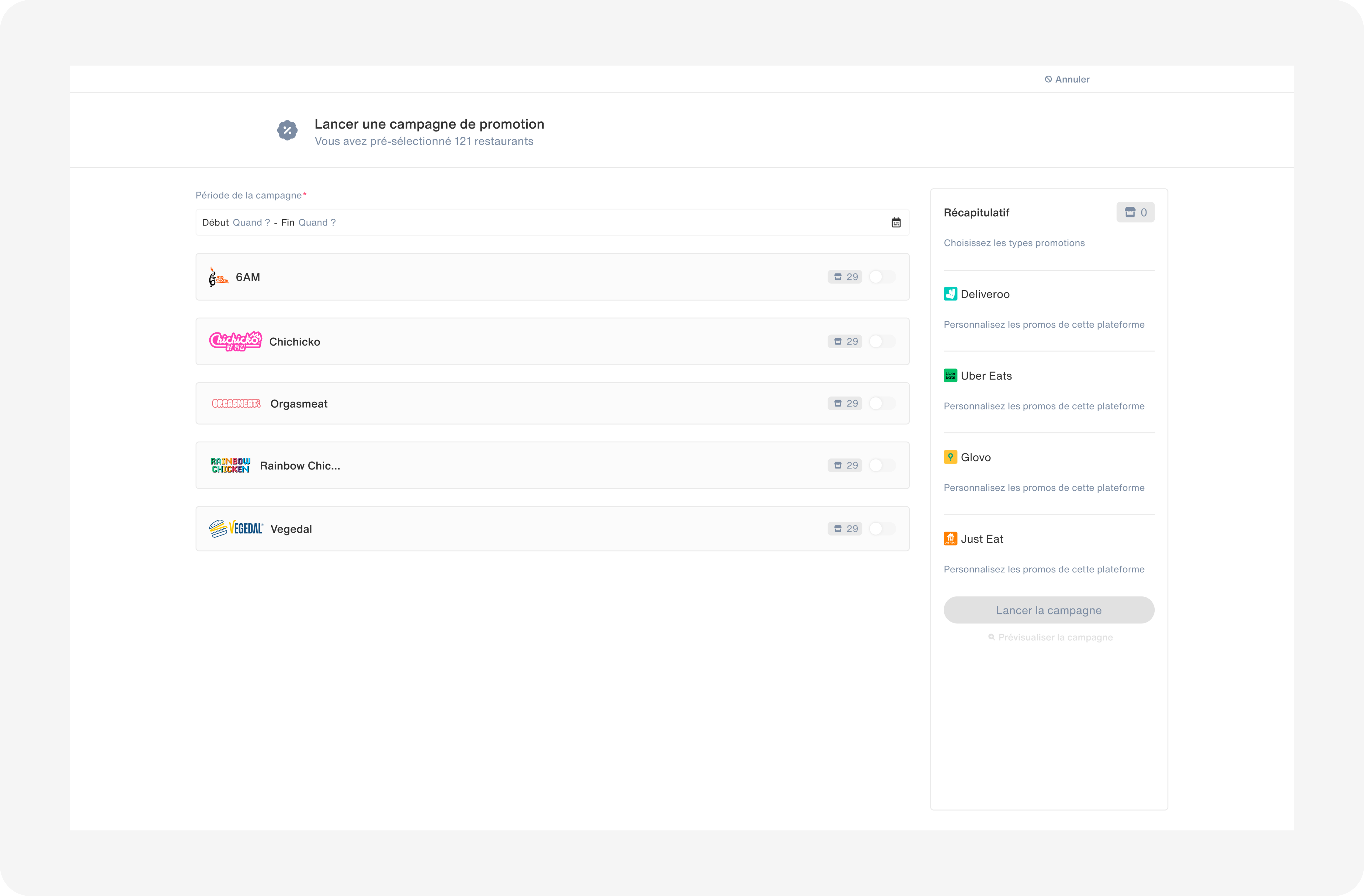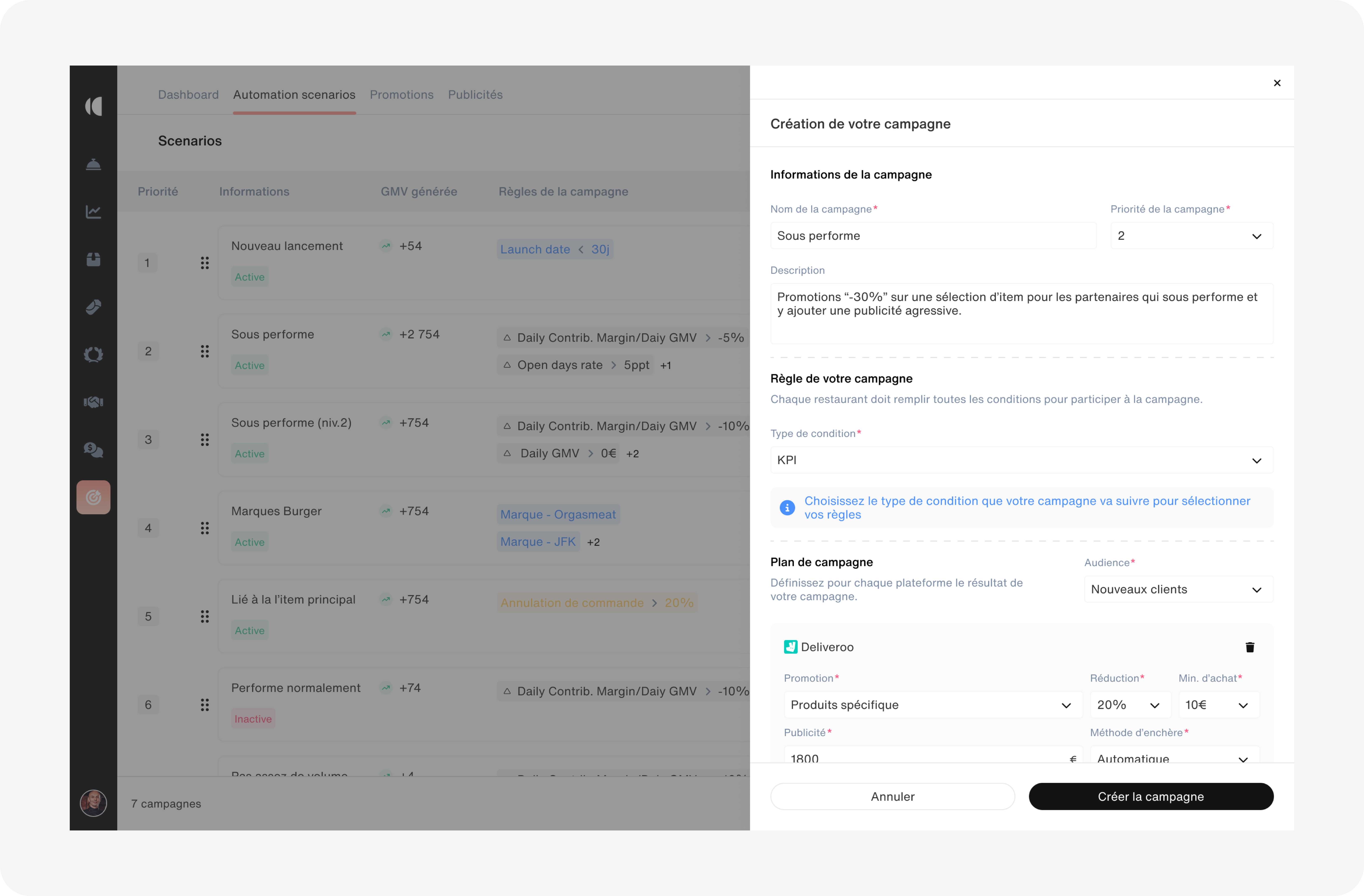 At Clone, as a Product Designer, I worked on a project to completely rethink the management of marketing campaigns for our virtual restaurants on Uber Eats and Deliveroo. Until now, these campaigns—whether promotions or advertisements—were managed through external tools like Flynt and Google Sheets.